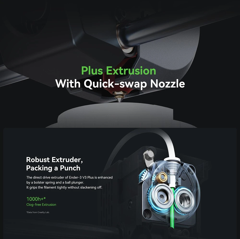 Say goodbye to clogs and filament jams with the advanced extrusion system of the V3 Plus. It features a robust 60W hotend and a low-maintenance, quick-swap tri-metal nozzle integrated with a heatbreak, ensuring reliable performance and easy upkeep.