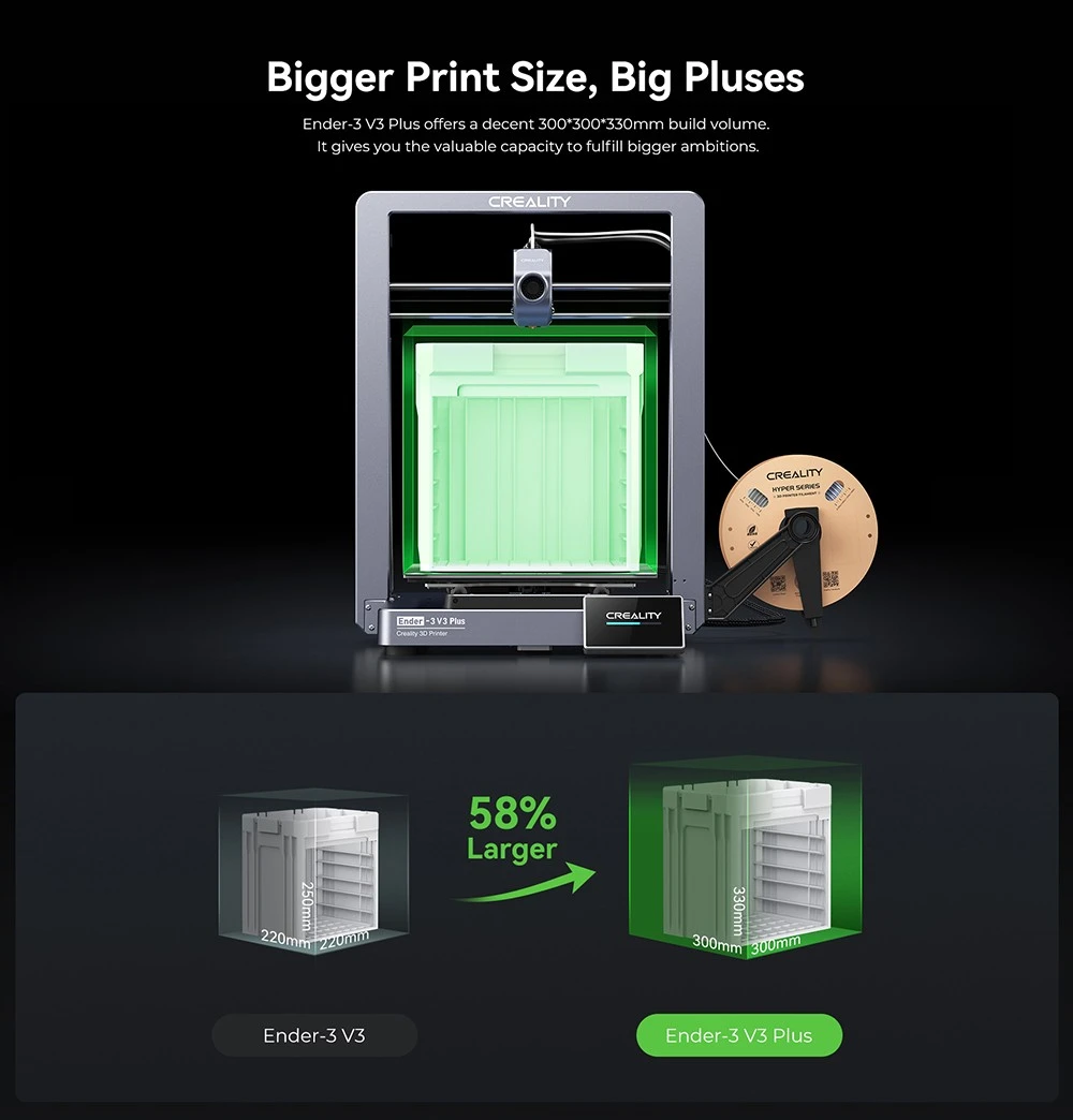 Creality Ender-3 V3 Plus, featuring a spacious 300*300*330mm build volume, is the latest CoreXZ-designed 3D printer aiming for all your printing needs. With Y-axis dual motors support rods under the revolutionary CoreXZ structure, this printer ensures stable and precise printing of up to 600mm/s; with two powerful part cooling fans ensuring optimal print quality. The reliable clog-free extruder kit and quick-swap tri-metal nozzle make printing a breeze. Whether you’re a beginner or an experienced user looking to print objects of larger size, the Creality Ender-3 V3 Plus is the perfect choice for all your 3D printing projects.