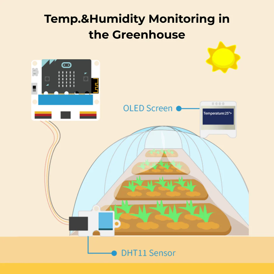 The micro:bit Smart Agriculture Kit has a well-selection of IoT:bit, DS18B20 temperature sensor, soil moisture sensor, water level sensor, PIR sensor, servos and etc., we could use it to build such themes as the smart insects repelling machine, the ecological greenhouse, the fish pond water level monitoring device and more, from which we can learn the modern agriculture and program and explore more possibilities to apply the information technology in agriculture.
