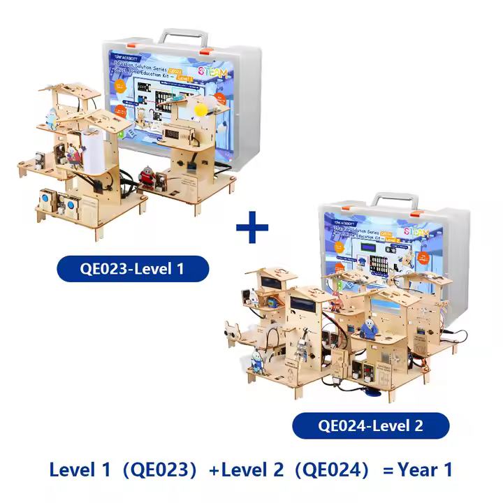 Level 1 QE023: it is “3 in 1” learning kit, this kit only has one controller board, so user can assemble one of these three projects at each time Level 2 QE024: it is “5 in 1” learning kit, this kit only has one controller board, so user can assemble one of these five projects at each time